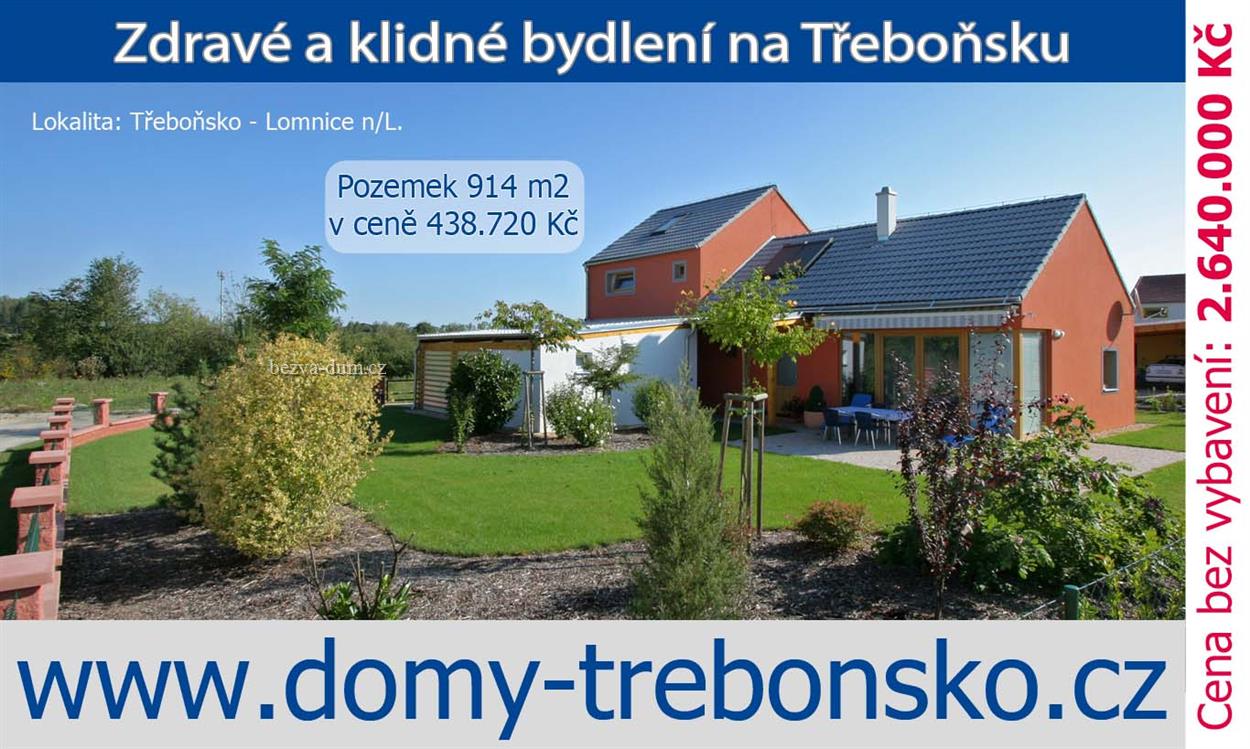 Cena 2.640.000,- Kč vč. DPH a pozemku platí do 30.11.2011 Rodinný dům 5+kk se zahradou o celkové výměře 914 m2 se nalézá na malebném Třeboňsku u rybníka Jindrlov v městečku Lomnice nad Lužnicí. Dům je realizován jako jeden z posledních volných domů v projektu DOMY TŘEBOŇSKO. Nedaleko se nacházejí světoznámé lázně Třeboň (Aurora, Bertini lázně). Vzdálenost do hlavního města Prahy činí cca. 100 km. Lomnici nad Lužnicí protíná páteřní komunikace mezi Třeboní a Veselím nad Lužnicí, dále směr Praha. Lomnice nad Lužnicí je krásné městečko ležící na řece Lužnici při hranici CHKO Třeboňsko, 10 km severozápadně od Třeboně. RD se skládá ze dvou podlaží - přízemí (obývací pokoj, ložnice, kuchyňský kout, toaleta, koupelna, technická místnost, chodba) a prvního patra (3x pokoj, koupelna s toaletou, chodba). Jednoznačně je oddělena společenská část domu od intimního klidového prostoru. K domu je možné přistavět garážové stání se skladem zahradní techniky.